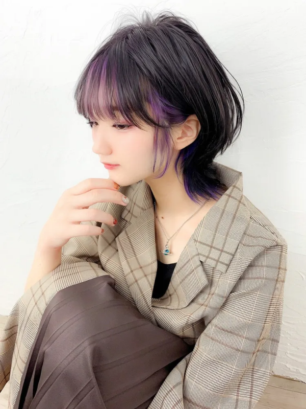 毛先に動きが出て暗髪でもおしゃれなスタイリングが簡単にできるマッシュウルフに、パープル系のバングカラーを入れたヘアスタイルです。