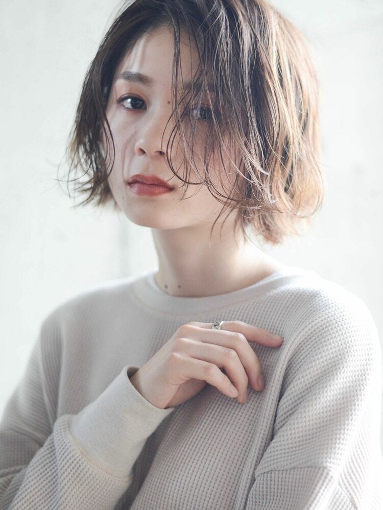 ヘアオイルやヘアバームを使って仕上げた、ハーフウェットなショートボブ×パーマのヘアスタイルです。