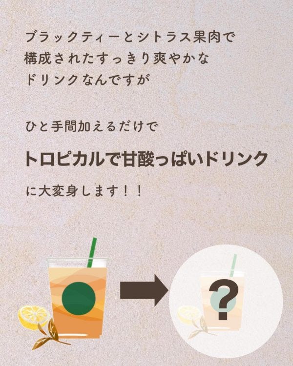 ブラックティーとシトラス果肉で構成されたすっきり爽やかなドリンクですが、一手間加えるだけで「トロピカルで甘酸っぱいドリンク」に大変身するんです!