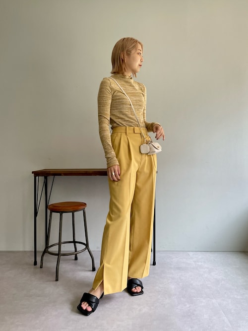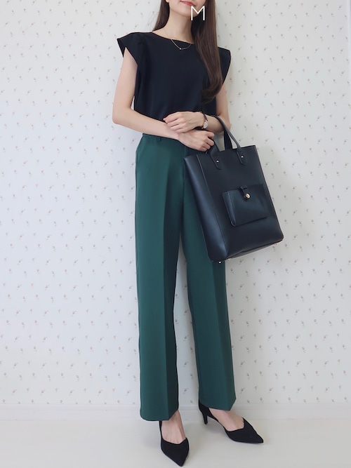 フレアシルエットのパンツは、すらりと美脚に魅せつつ、エレガントな表情を作ります。ユニクロのフレアパンツは、しなやかなドレープ素材でエレガントさアップ。センタープレスで脚をまっすぐに見せます。