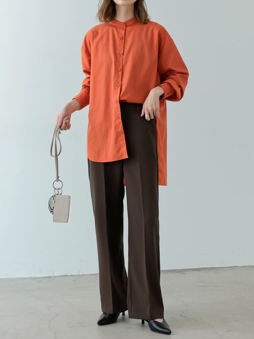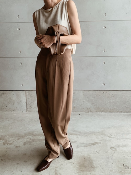 ハイウエストのパンツなら脚長効果アップ。裾に向かって細くなるテーパードシルエットは、細身にも見せます。ほどよくゆとりのあるシルエットなら、脚のラインを拾わず楽ちん。ダークブルーは上品に見えます。