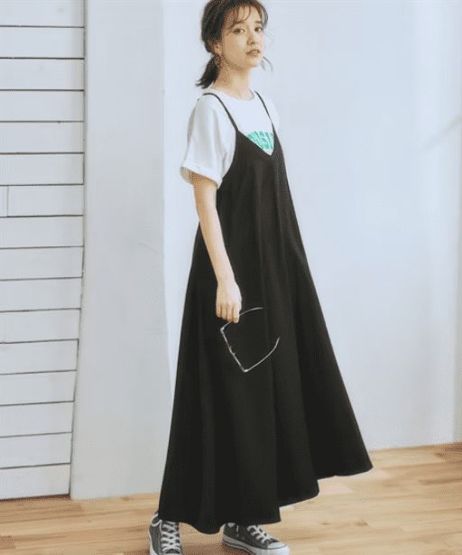 最初にご紹介する、夏本番に活躍するお腹まわりをカバーすることができるワンピースは、キャミソールタイプのアイテムです。