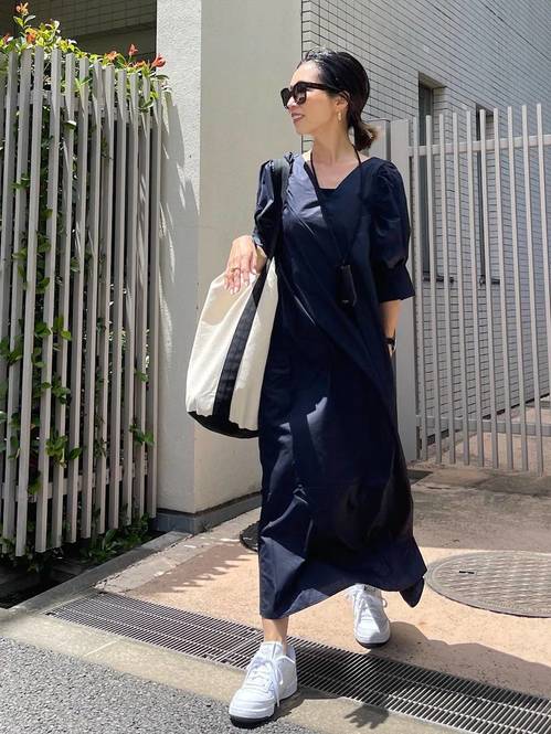 そこでおすすめしたいのが、着るだけで痩せて見える、Vネック×パフスリーブデザインのネイビーワンピースを主役にした夏コーデです。