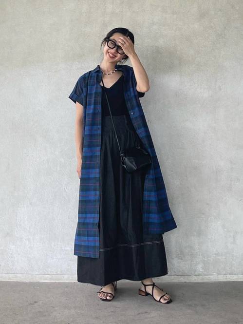 【ネイビーワンピース】痩せて見える夏コーデ②チェック柄シャツワンピースを羽織る♪