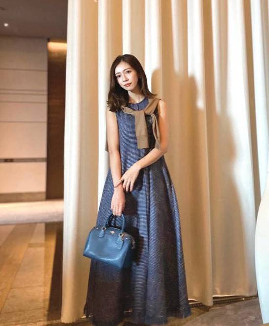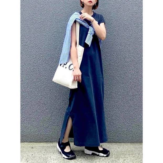 最後にご紹介するのは、キーネック×Aラインシルエットのネイビーワンピースを使った夏コーデです♡