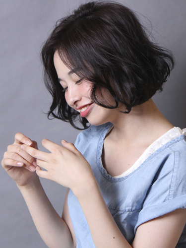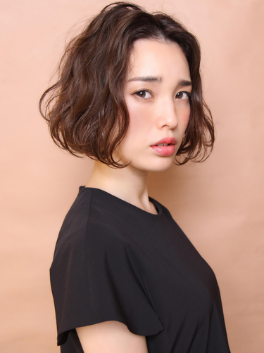 前髪なしのパーマボブは丸顔の大人女性に似合いやすい髪型で、気になる顔形を髪型でカバーできます。