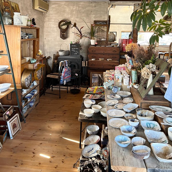 お店には靴を脱ぎ、スリッパに履き替えて入ります。入ってすぐのところには、食器や時計などのインテリア雑貨がずらり。どれも購入することができるので、かわいい雑貨を見つけたらぜひ手に取ってみてください。