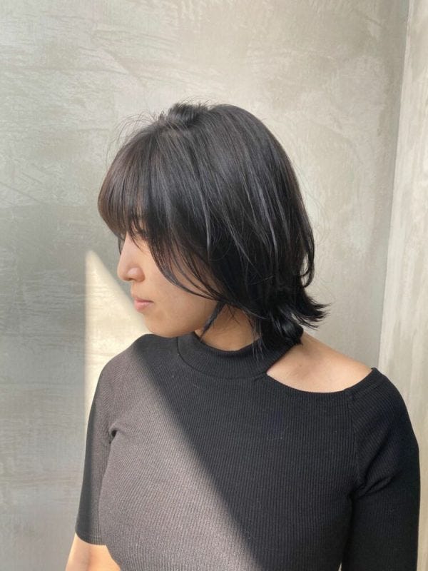かっこいい雰囲気が作りやすいウルフスタイルのレイヤーボブは、黒髪でもかっこいいですが、ダークブルーで透明感をプラスするとより40代の大人女性に似合う仕上がりになります。