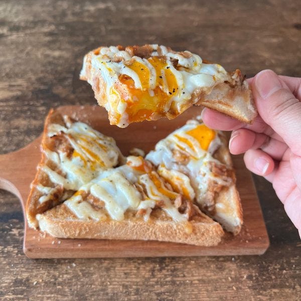 温泉卵がトロッととろけてツナや食パンに程よく絡みます。上にかけるマヨネーズも照り焼き味にマッチして、贅沢な味わいが楽しめますよ。