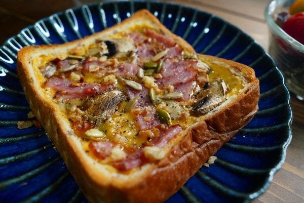 食パンの柔らかい部分をギュッと押して窪みを作り、卵や牛乳、粉チーズで作る液を入れて、具材のベーコンやマッシュルームをのせて焼くおかずトースト。