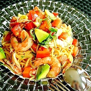 楽天レシピ:「エビとアボガドとまとのヘルシー冷製パスタ 」より