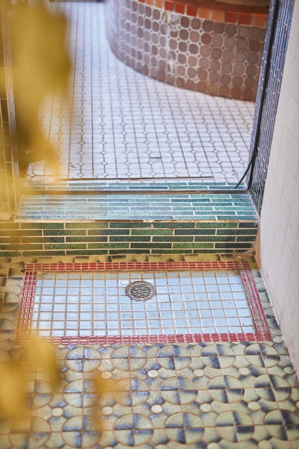 洗い場と湯船の境目の段差もそのまま。さまざまなモザイクタイルは、町の人々に長く愛されてきた記憶が染みついたかけがえのないもの。