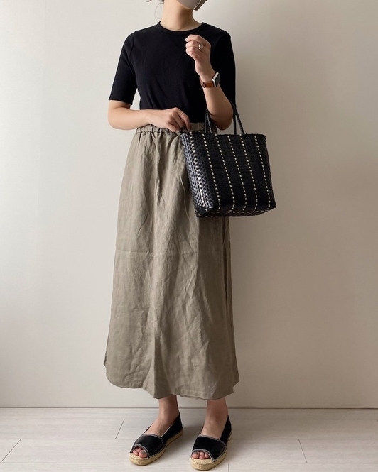 Tシャツを合わせた簡単コーデも、このスカートだといつもより大人な雰囲気◎