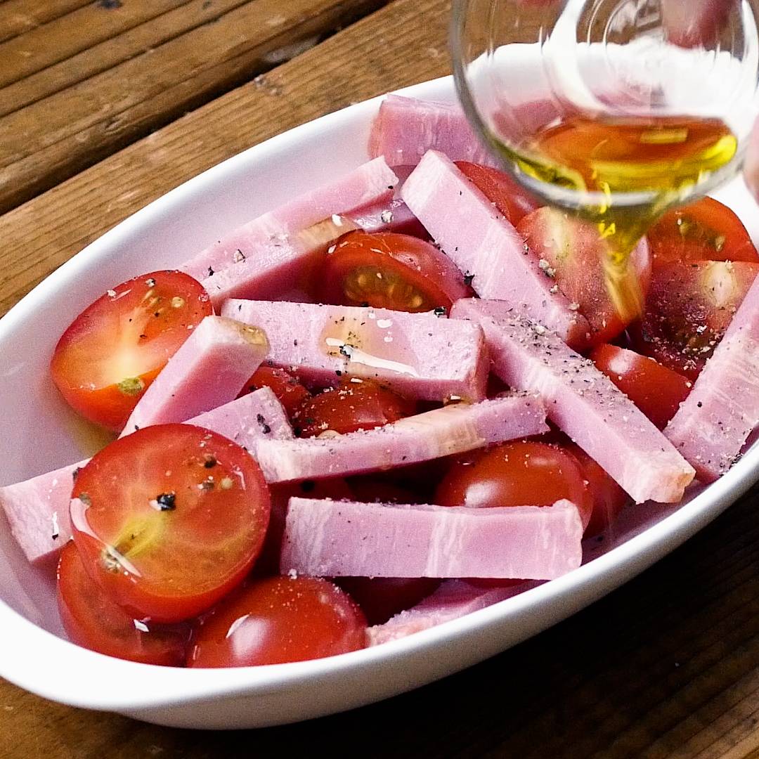 ・ミニトマト … 10個・ブロックベーコン … 60g・とろけるチーズ … 20g・塩 … 少々・粗挽き黒こしょう … 少々・エクストラバージンオリーブオイル … 小さじ2杯トッピング・パセリ … 適量【下ごしらえ】ミニトマトとベーコンのチーズ焼き