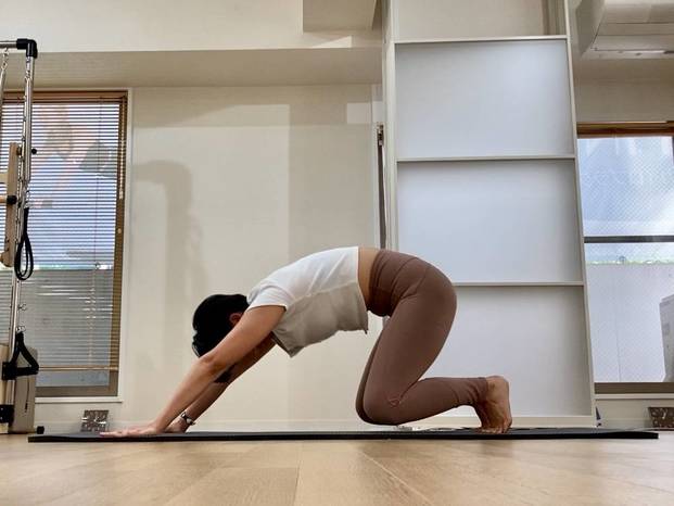 2. エクササイズ①のキャットストレッチのように、背骨を丸めて前方へ体重移動。