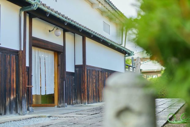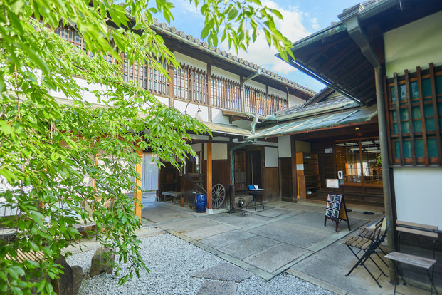 その広大な建物は、広さ間口約65m、奥行き約36mの表屋造り(おもてやづくり)。道路に面した部分に店舗棟、奥に母家の建物が別々に立ち、両棟の間に中庭を配した大きな町家で、向かいには37台分の駐車場も完備されています。