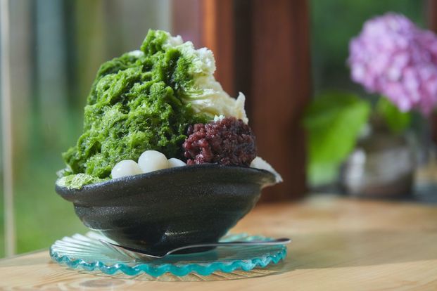 特等席はなんといっても窓際でしょう。横並びに座るので、カップルのデートスポットにもよさそう。かき氷を待っていると庭からウグイスの鳴き声が聞こえてきました。