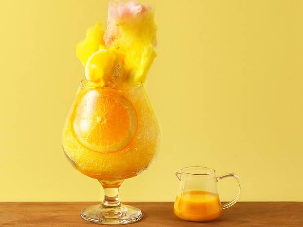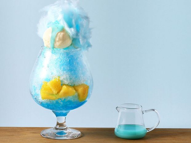 ブルーのドレスを着たサリーをイメージした、見た目にも涼しげなブルーハワイのかき氷。フローズンパイナップルに、涼やかなブルーのジュレやコットンキャンディーと、いろいろな食感を楽しめます。ヨーグルト風味のソースをかければ、より一層爽やかな味わいに。