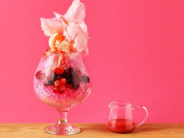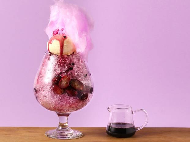 パープルカラーの女の子といえばバイオレット。ぶどう味のかき氷とグレープコットンキャンディーで彼女を表現しています。パリッとジューシーな完熟ぶどうに果汁シロップで鮮やかなパープルに。果肉入りのぶどうソースをたっぷりかけてどうぞ。