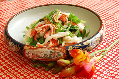 カニカマと春雨を使った、さっぱりとした酸味と、ゴマ油の香り豊かな中華風サラダはいかがでしょうか。味のアクセント入れた、薄焼き卵がとてもgood。夏のおつまみにもピッタリのひと品です。