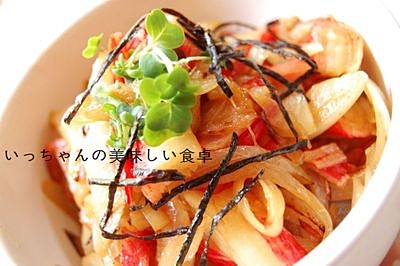 かにかまと玉ねぎのさっぱりマヨ醤油炒め