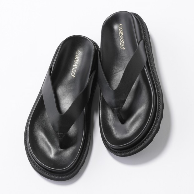 引き続きトレンドのぽってりトングサンダルは、コーデにほどよいモード感をプラスしてくれます。高級感のあるレザー素材かつ、幅の狭いストラップを使用しているため、メンズライクになりすぎないのがうれしい。サンダル¥19,800(カミナンド/グラビテート)
