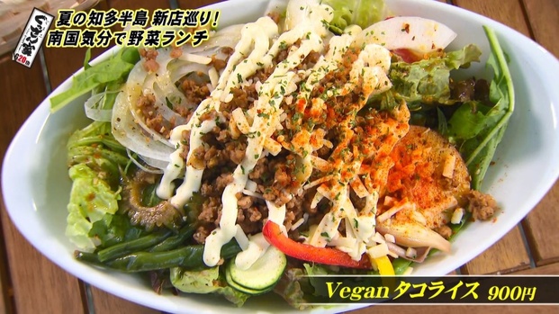 ぐっさんが注文したのは『Veganタコライス』(900円)。10種類以上の野菜を使用し、いま注目のヘルシー食材『大豆ミート』を盛り付けたボリューム満点の一皿。ぐっさんも「見た目、元気になりますもんね!」と喜びます。