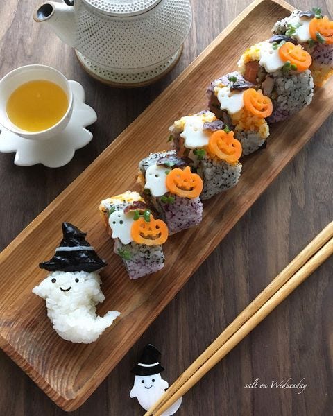 ハロウィンのお弁当には、かわいい巻き寿司もおすすめです。具材を巻き込む巻き寿司なら、ほかにたくさんの料理がなくてもお弁当として成り立ちますよ。