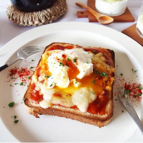 食パンに市販のミートソースとチーズをのせたらトースターで焼き、ポーチドエッグを盛り付けるだけの簡単アレンジレシピです。