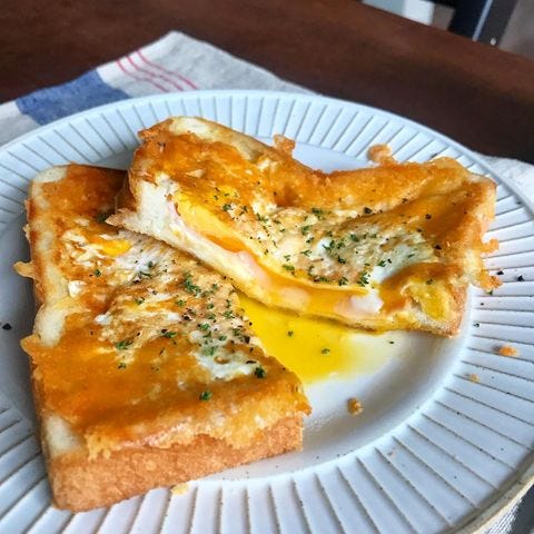 半熟卵の濃厚な味わいも楽しめ、贅沢気分を味わえます。半熟卵が好きな方は、食パンを裏返しにしたあと1分半ほど焼くのがポイントです。