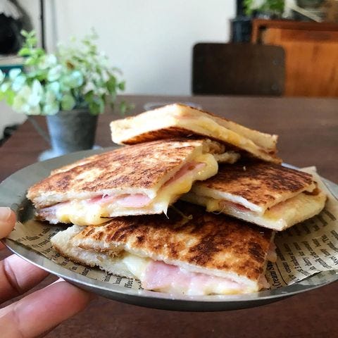 食パンの真ん中をくぼませたところに、マヨネーズ・ハム・卵・チーズをのせ、両面をしっかり焼くだけの簡単レシピも人気です。