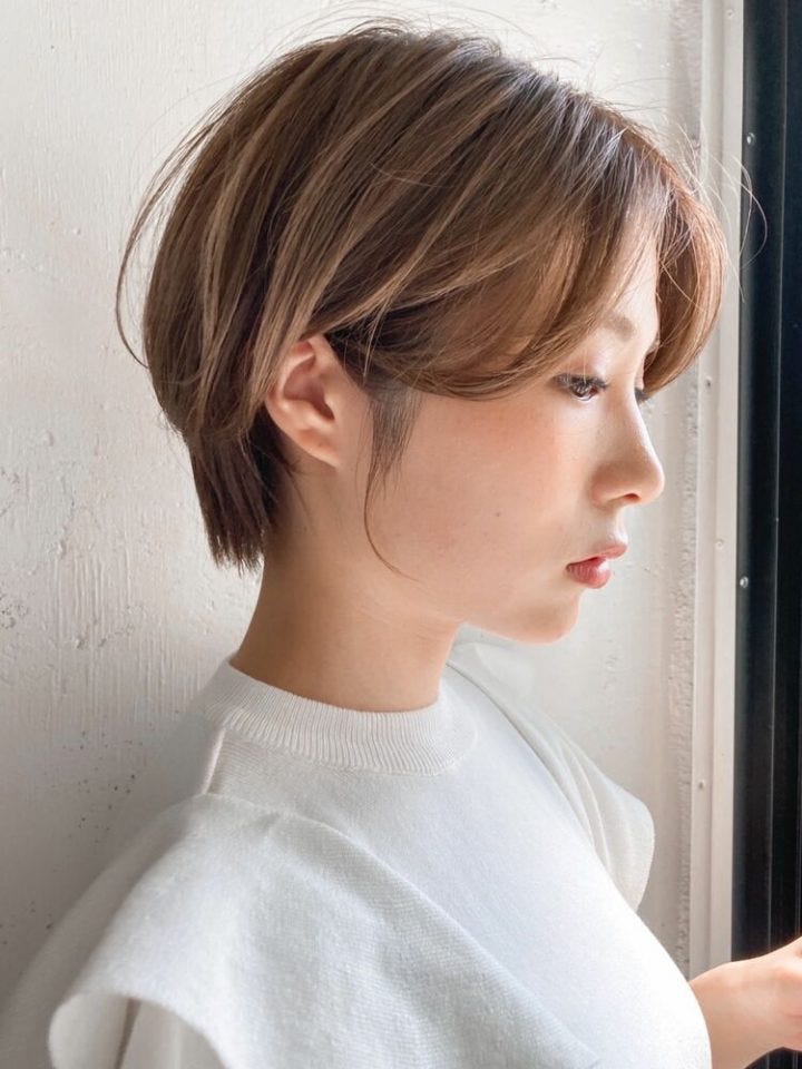 ショートヘア×前髪なしだと少しきつい印象になりますが、前髪があるだけでマイルドでこなれ感のある雰囲気になります。