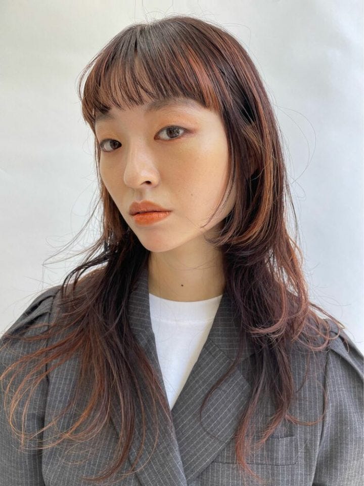 黒髪ぱっつんも定番人気ですが、顔周りを華やかに見せてくれるオレンジ系のハイライトも可愛いです。