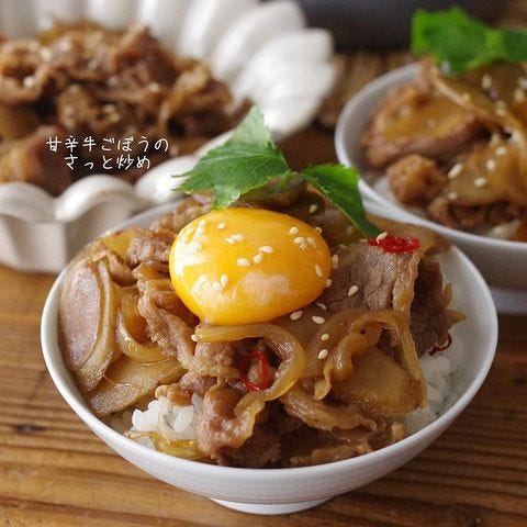ご飯がよく進むおかずの定番牛肉の甘辛煮です。おのずとオンザライスで牛ごぼう丼として食べてしまうレシピですよね。