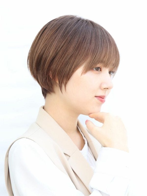 襟足がすっきりとしているショートのため重すぎず、前髪をわけておでこを見せることでボリュームがあっても暗くなりすぎずおすすめですよ。