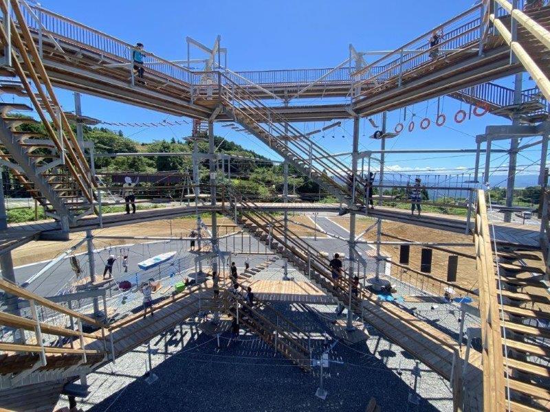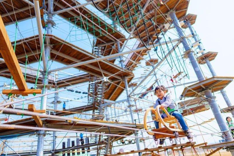 「ドラゴンキャッスル」は、子どもも大人も遊べる超巨大なジャングルジム。地上部、高さ1mのキッズコース、高さ3m、8m、13mのアスレチックコース、高さ17mの展望デッキの全6階層に分かれたアスレチックタワーです。