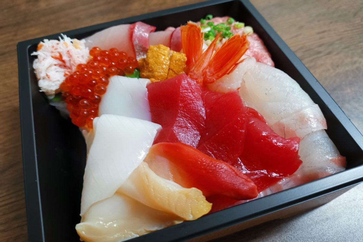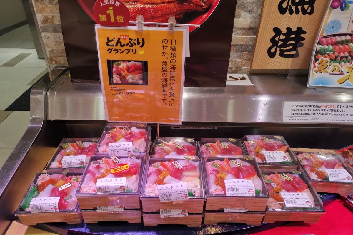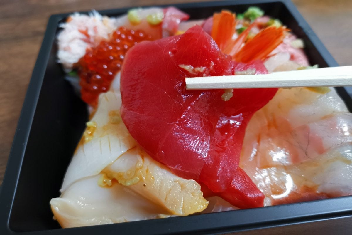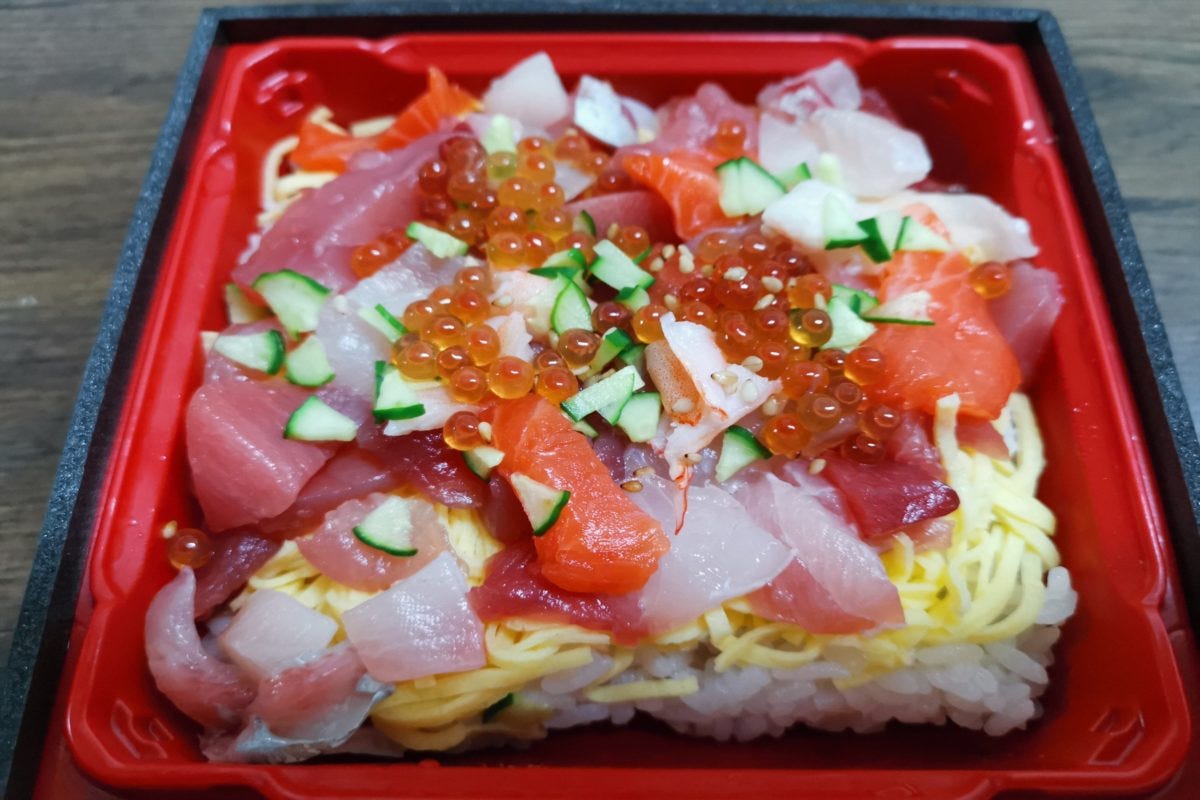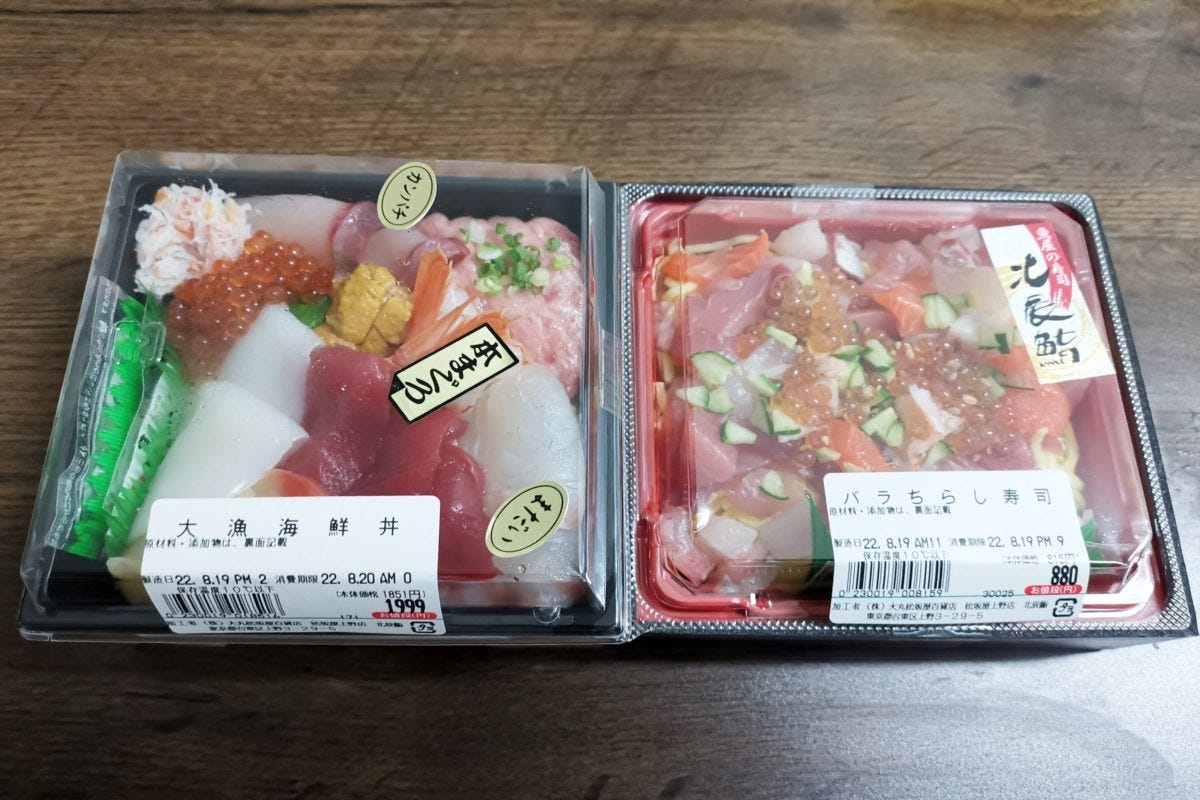 さっそく大漁海鮮丼を試食するため購入。予算の3,000円よりかなりあまったので、バラちらし寿司もあわせて買ってみた。