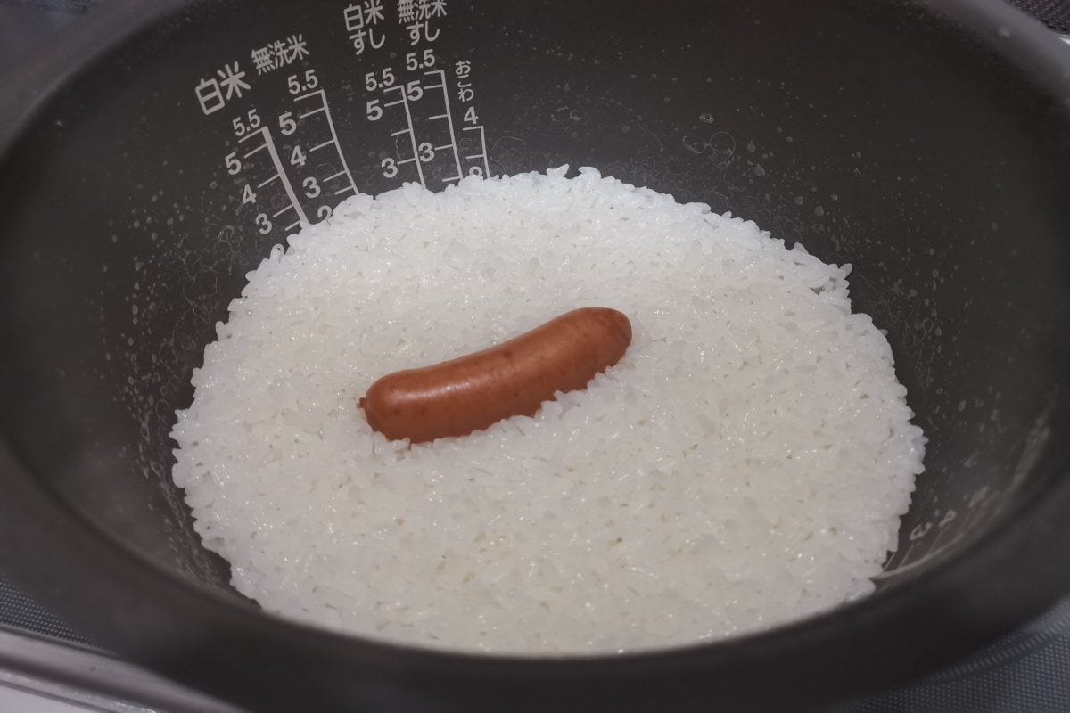 詳しい炊き方は、いつものお米の水量を入れたらウインナーをのせるだけ。とても簡単だ。