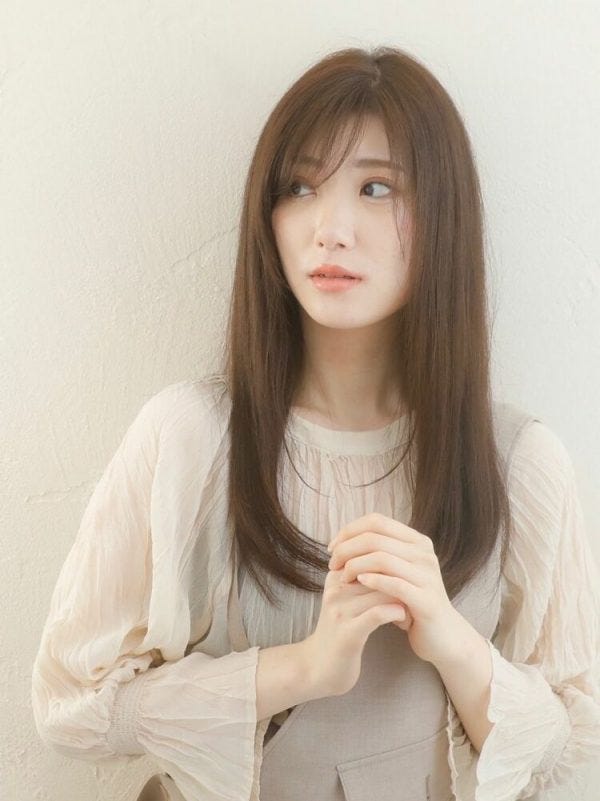 前髪が広いため顔が丸く見える効果も期待でき、面長さんにも似合いやすいロングの髪型ですよ。