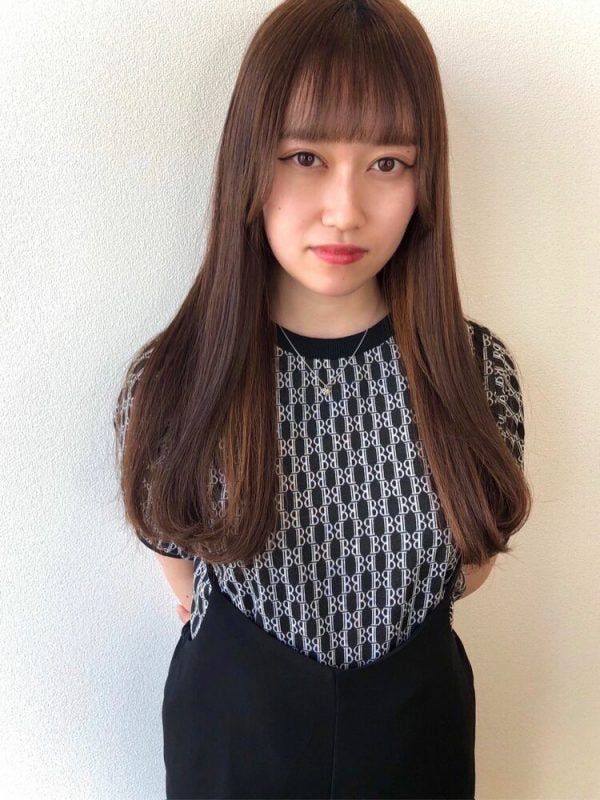 黒髪のストレートロングの髪型は垢抜けない印象になりがちですが、前髪を広めにしてこなれ感たっぷりで秋の流行も取り入れたヘアスタイルにするのがおすすめです。