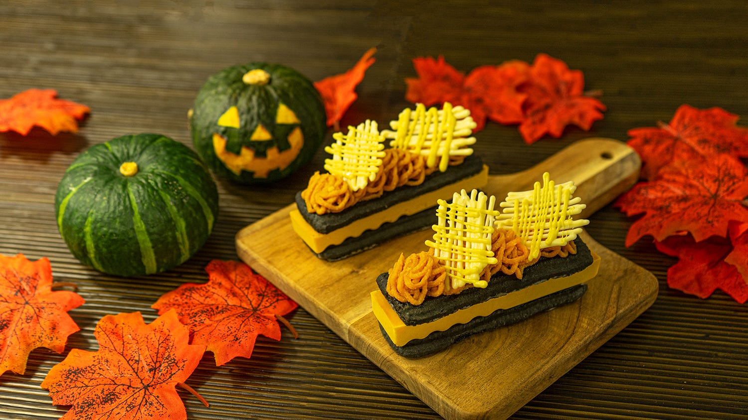 一方「街のエクレア かぼちゃチーズケーキ」は、インパクト抜群な、真っ黒なエクレア。ねっとりとしたあまさが特徴のかぼちゃ、北海道産えびすかぼちゃのペーストを練り込んだベイクドチーズケーキをサンド。かぼちゃのねっとりとした優しいあまさが楽しめる濃厚な味わいに仕上がっている。