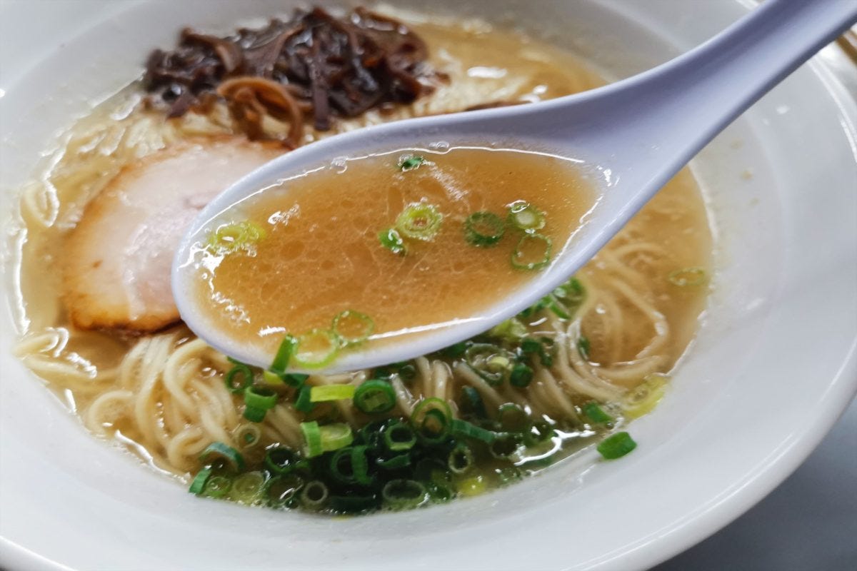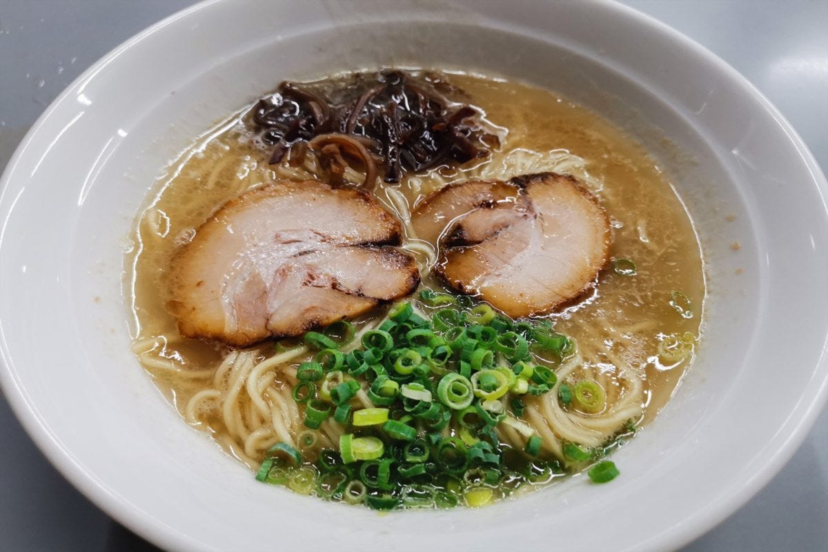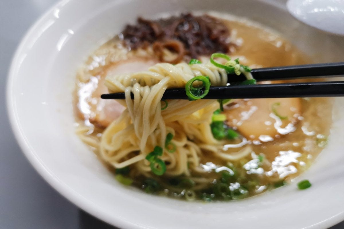 さっそく博多ラーメンを注文すると、ほどなくして着丼。香りは思ったほど豚骨臭くなく、博多ラーメンが苦手な人でも十分楽しめそうだ。