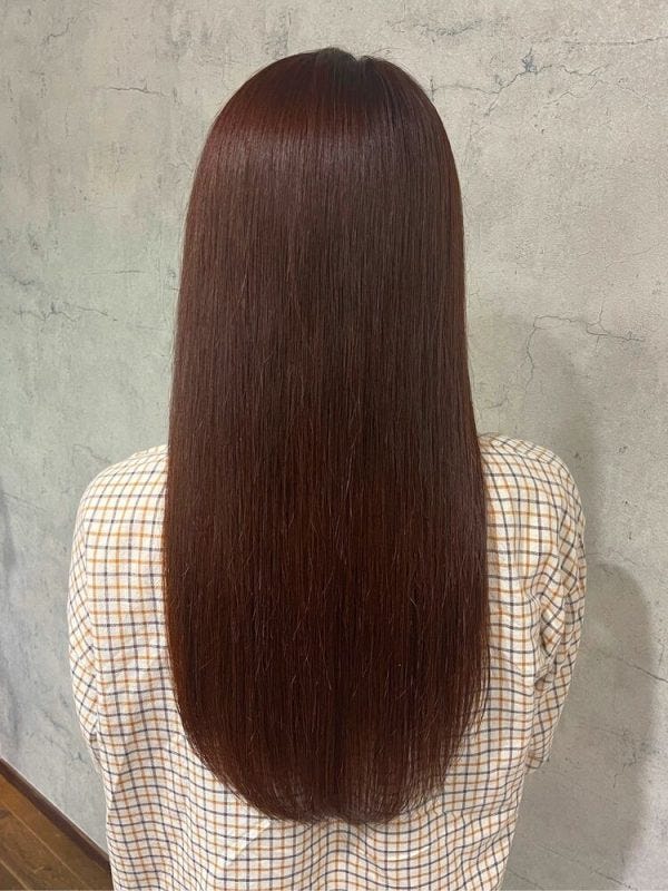 ボリューム感を控えめにすれば、暗めのストレートロングでも重くなりすぎず、おしゃれでトレンドライクな仕上がりになりますよ。