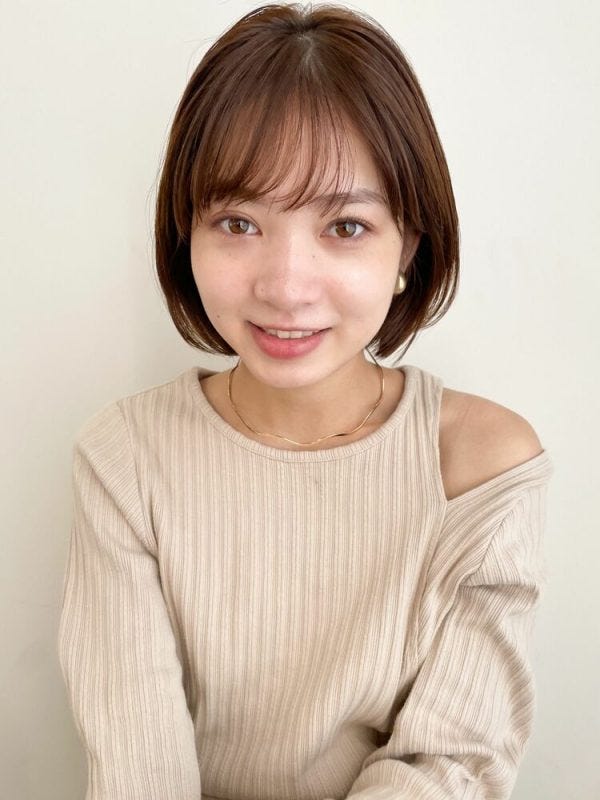 前髪からつながるサイドの髪の毛が少し長めにカットされているところも、小顔効果に見えるポイントです。