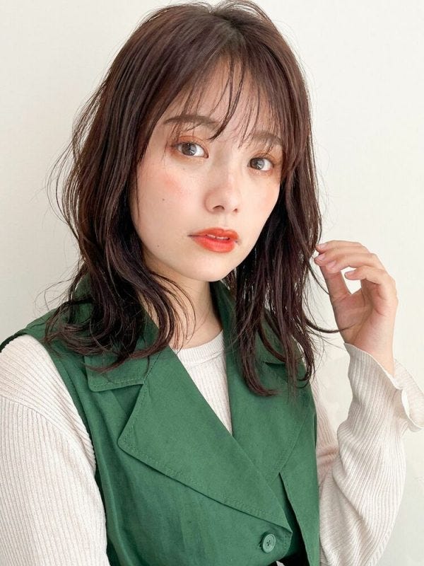 毛先にゆるくパーマをかけたミディアムウルフヘアは、エラ張りをカバーしてくれる人気の髪型です。