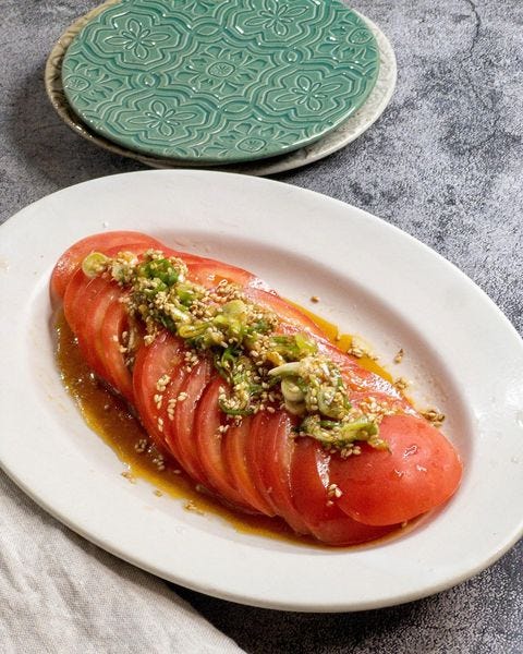 作り方は簡単で、スライストマトに香味だれをかけるだけです。トマトは2人分で1個使いましょう。