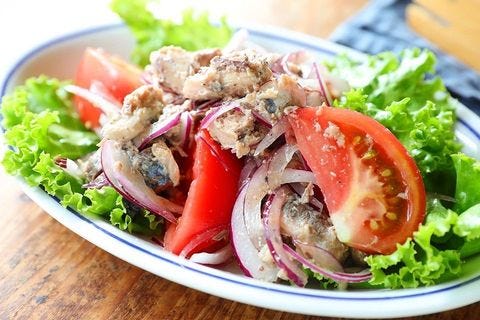 さばとトマトのごまポン酢サラダは、手軽なさば缶を使う人気レシピです。