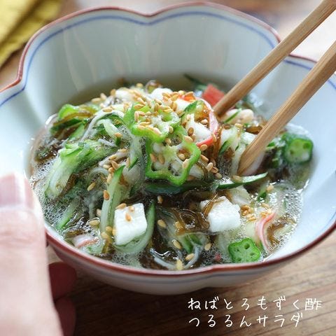 もずく酢のつるるんサラダは、ねばねばとろとろな食感が人気の副菜レシピです。