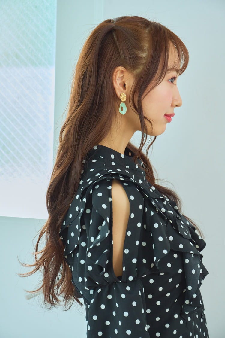 みよまる流三つ編みアレンジのポイントは、毛先を長めにして巻くことと、分け目をジグザグにとることの2つ。顔まわりの髪を多めにとることで、小顔効果も狙っているよ。