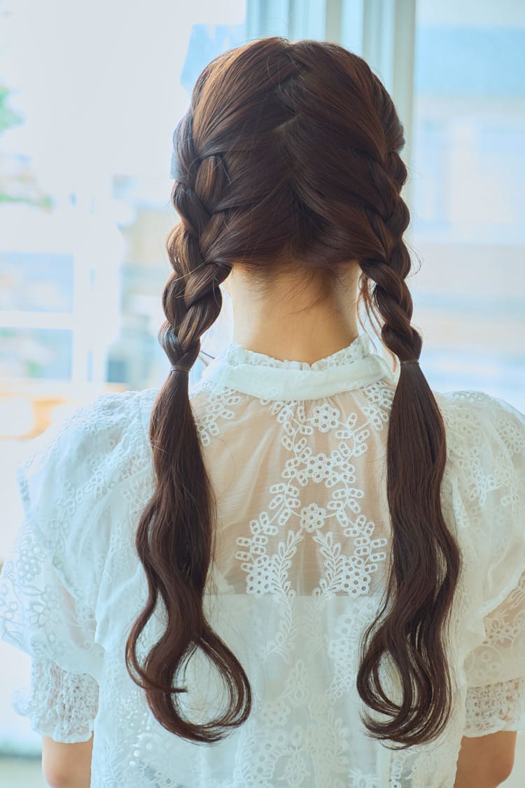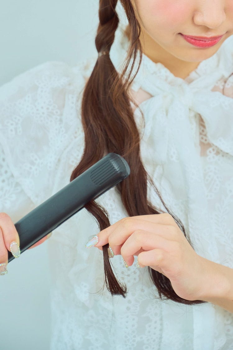 三つ編みの毛先を長めにとったら、アイロンで巻いて可愛さをプラス。